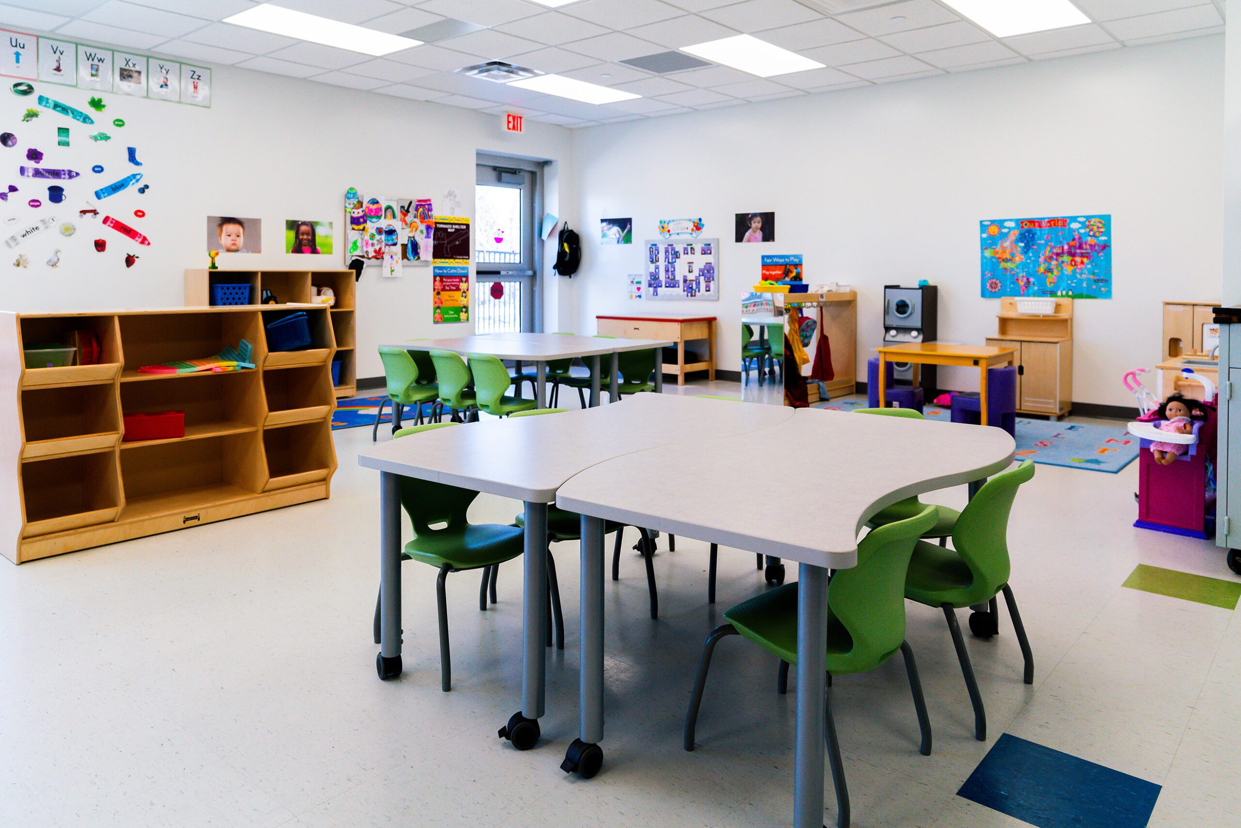 Early childhood classroom with green chairs, shaped tables, colorful rugs, and open shelving for learning materials.